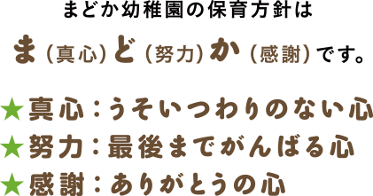 まどか幼稚園では、創立以来、変わらず「真心/まごころ・努力/どりょく・感謝/かんしゃ」のまどか心を保育方針の大きな柱とし、季節を感じること、自然に触れ合うことを保育目標として、食育、自然体験教育にも力をいれています。日々の保育には自由保育を取り入れ、子どもたち一人ひとりが主体となって活動に取り組める環境を整えています。