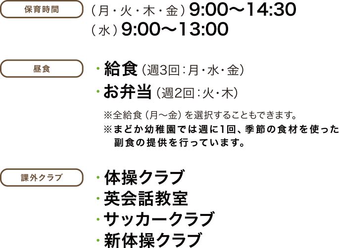 3年保育(3歳児) 60名 2年保育(4歳児) 若干名 1年保育(5歳児) 若干名 |